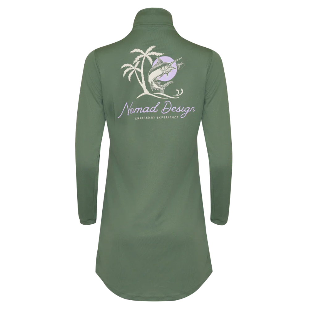 Stay cool, protected, and stylish with the Nomad Women's Tech Dress – Marlin Sunset. Designed for life outdoors, this lightweight long-sleeve dress is made from 100% polyester with a superfine mesh weave. It offers moisture-wicking and quick-drying comfort, perfect for fishing trips, beach days, and casual coastal wear. The quarter zip design and sun-smart fold-down collar combine function and fashion, while generous side pockets add practical convenience. With UPF 50+ protection and a vibrant Marlin Sunset print, this dress is made for active women who live the salt life.