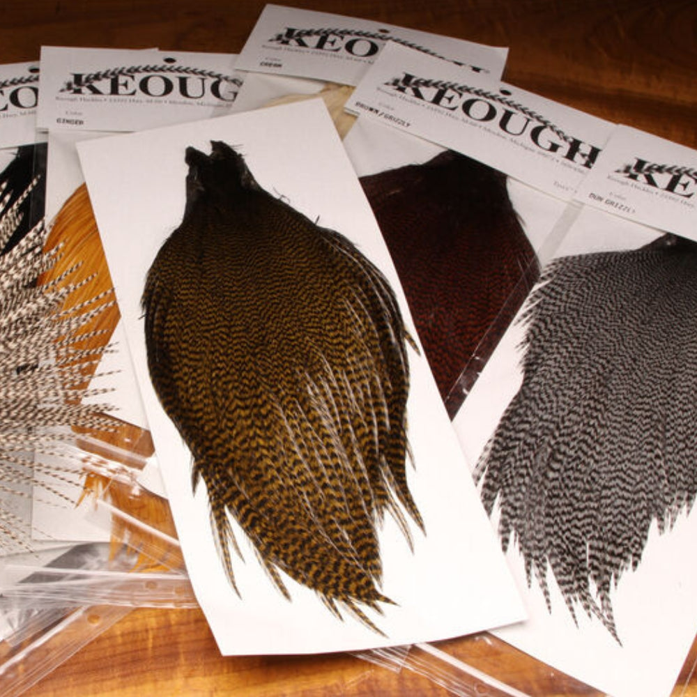 What sets the Keough Tyer's Grade Cape apart is its exceptional hackle feathers. These feathers boast flexible stems and excellent barb density, ensuring optimal performance in your fly-tying projects. The stiff barbs of these feathers will keep your dry flies floating high on the water.