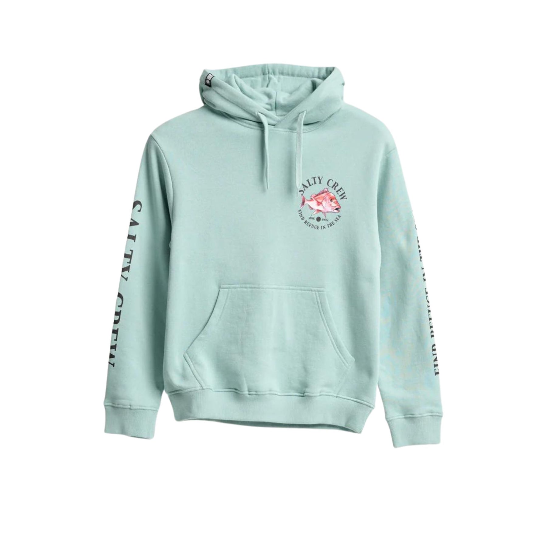 It features a two-piece hood with an encased drawcord, rib knit cuffs and hem for a snug fit, a convenient self-fabric kanga pocket, and a Salty Crew clamp label at the hood opening for a touch of authenticity.