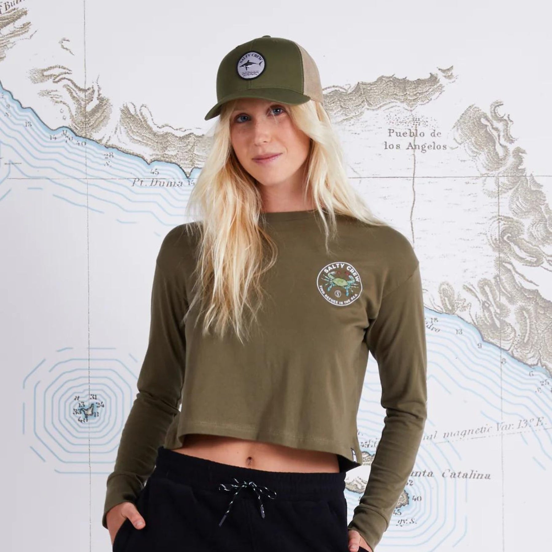 The Blue Crabber long sleeve crop in Military green. Boxy long sleeve crop top with custom Salty Crew screen print front, back and sleeves. Made from 100% Cotton jersey.
