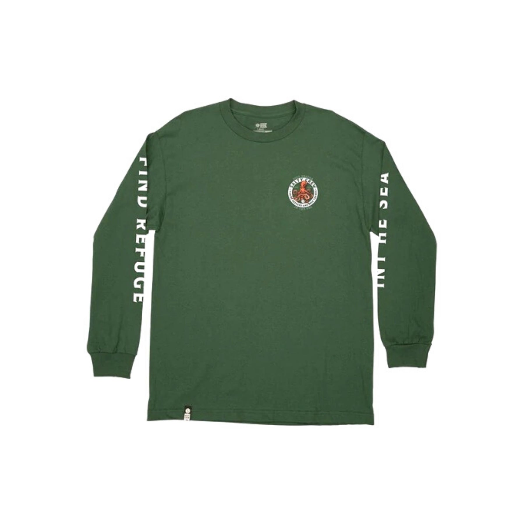 The Deep Reach L/S Tee in Spruce is a men's long sleeve t-shirt featuring a screen printed front, back and sleeves. Made from 100% cotton.