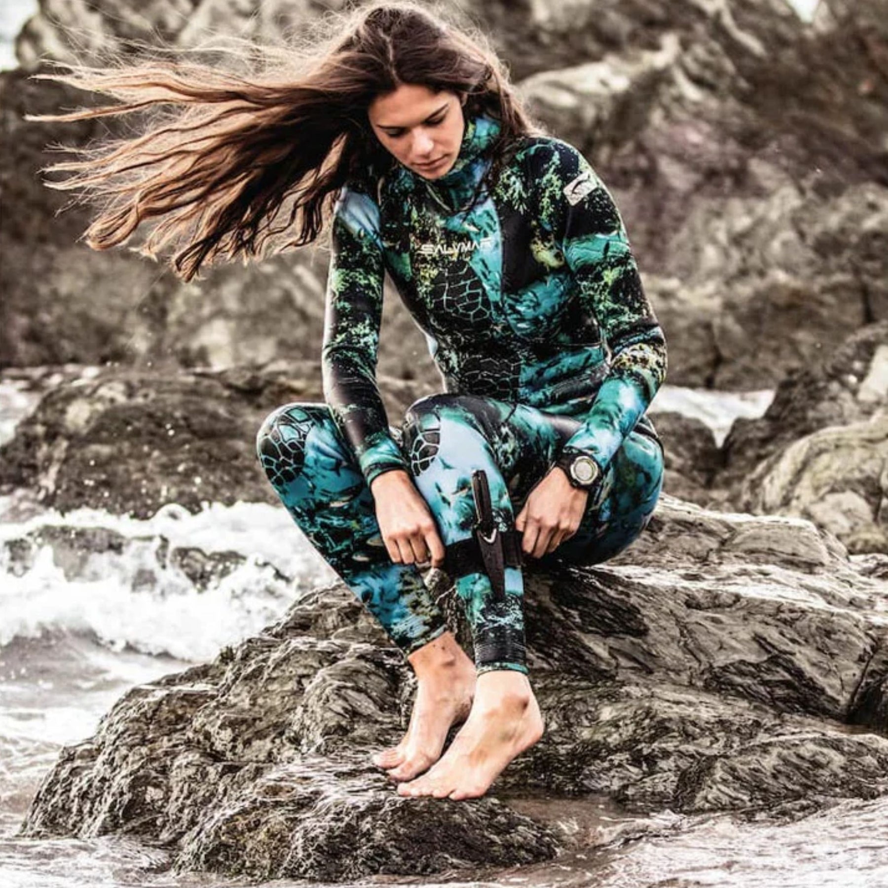 Salvimar Seawalker 3.5mm Open Cell Women's Dive Suit. Specifically crafted for female spearfishers, this wetsuit combines warmth and flexibility for unparalleled performance. The high-density 3.5mm open cell neoprene interior provides superior insulation and unrestricted movement, allowing you to dive with confidence. The two-piece design includes a hooded jacket and high-waist pants for a comfortable and secure fit. Reinforced with heavy-duty puff gum material in high-wear areas, this wetsuit ensures durability. The super-stretch spandex exterior lining enhances flexibility, while the double GBS cross seam construction guarantees strength and a water-tight seal. For easy entry, use a lubricant like Rob Allen’s Slippy.