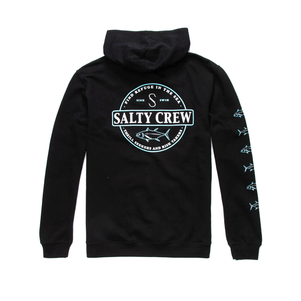 Salty Crew Zip Hoodie. Full zip. Small graphic screened on left chest. Graphics on both sleeves. Large graphic on back. Fleece lining. Split kangaroo pocket. Ribbed cuffs and hem. Fixed hood. 80% cotton 20% polyester. Machine wash. Imported.