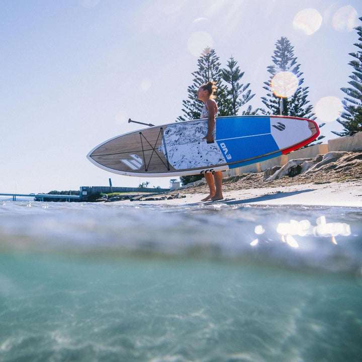 The EVO is the “All-Rounder” in our range. It has a nice shape template with flowing rail lines for smooth glide in flat water paddling. The board features a flatter deck and medium rails, with a little extra width in the nose and tail for stability.