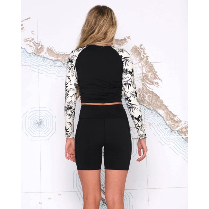 Salty Crew Bike Short in Jade Camo/ Black, High waisted, mid-length bike short. Features side pocket on the right leg and Salty Crew Flag logo. UPF 40 Sun Protection and quick dry feature, fabric hugs and hold the body with a 4-way stretch. Made from 73% Nylon/ 27% Elastane Double Knit