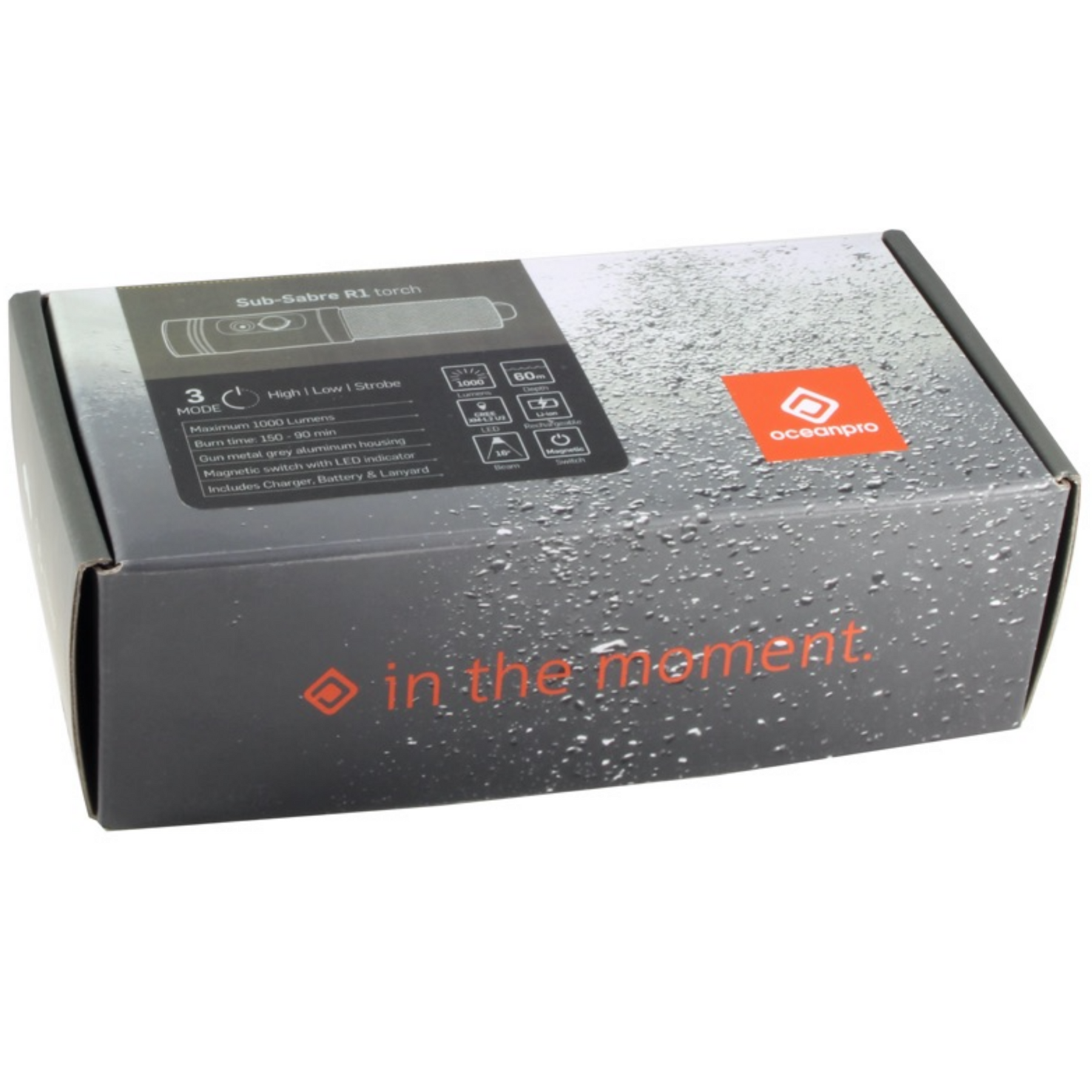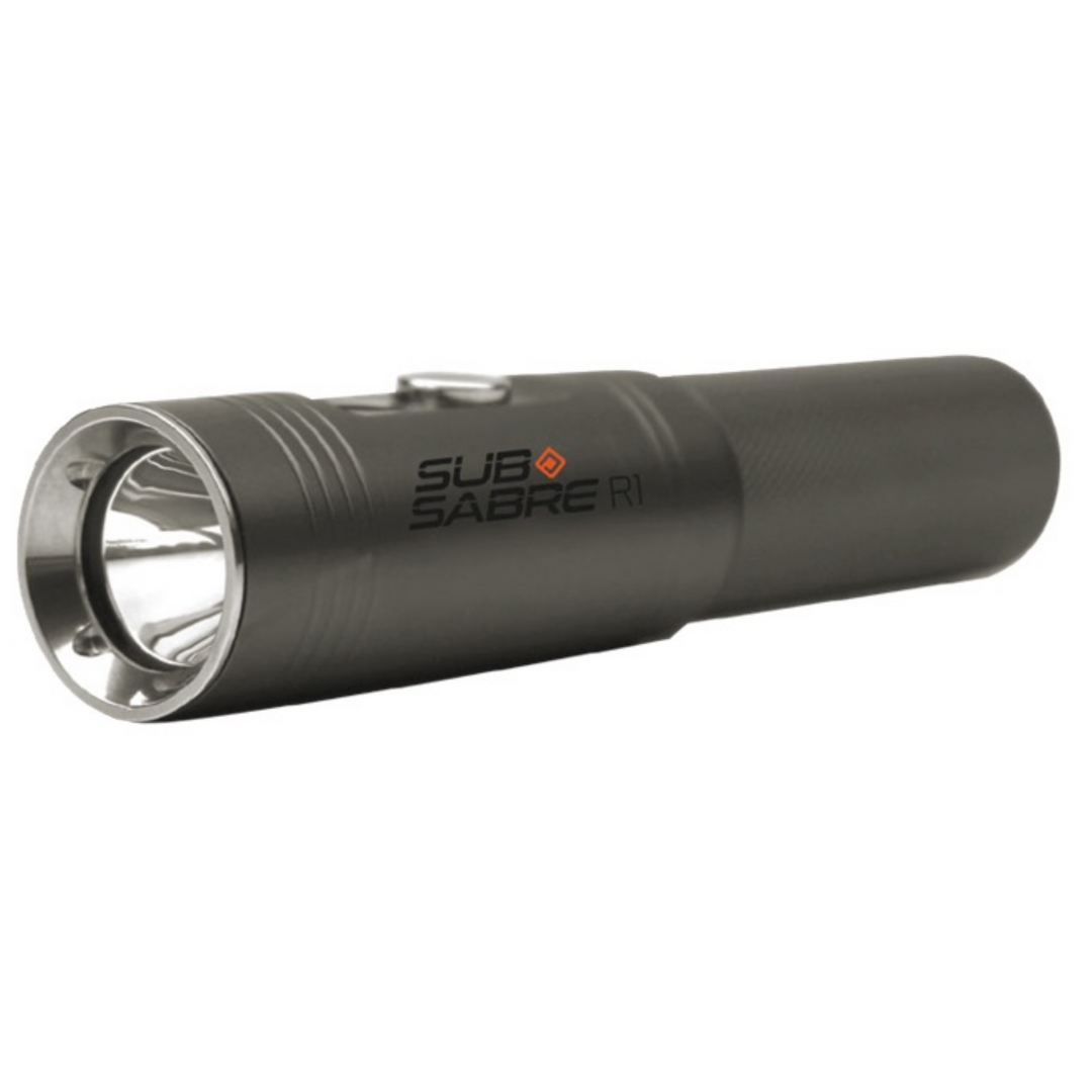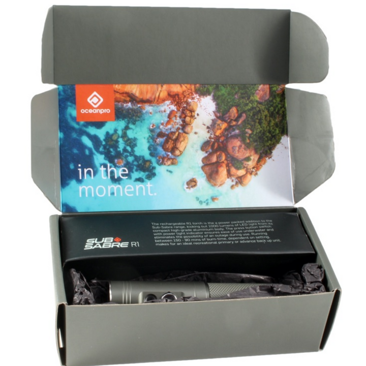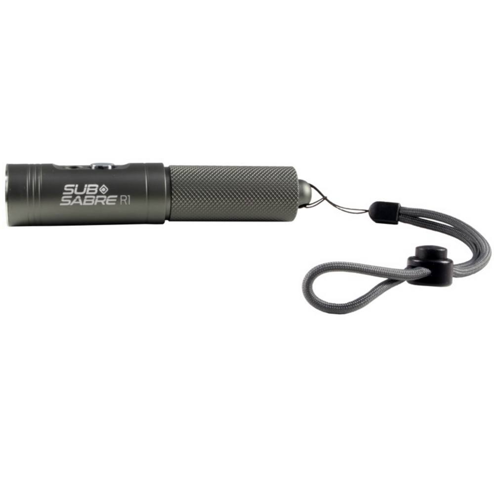 The Ocean Pro Sub-Sabre R1 Dive Torch delivers exceptional underwater illumination with 1000 lumens of LED output from its compact, high-grade aluminum construction. Its reliable press button switch with power indicator prevents unexpected outages during dives. With 90-150 minutes of operation depending on selected intensity, this rechargeable unit serves effectively as either a primary light source for recreational divers or a sophisticated backup for technical applications.